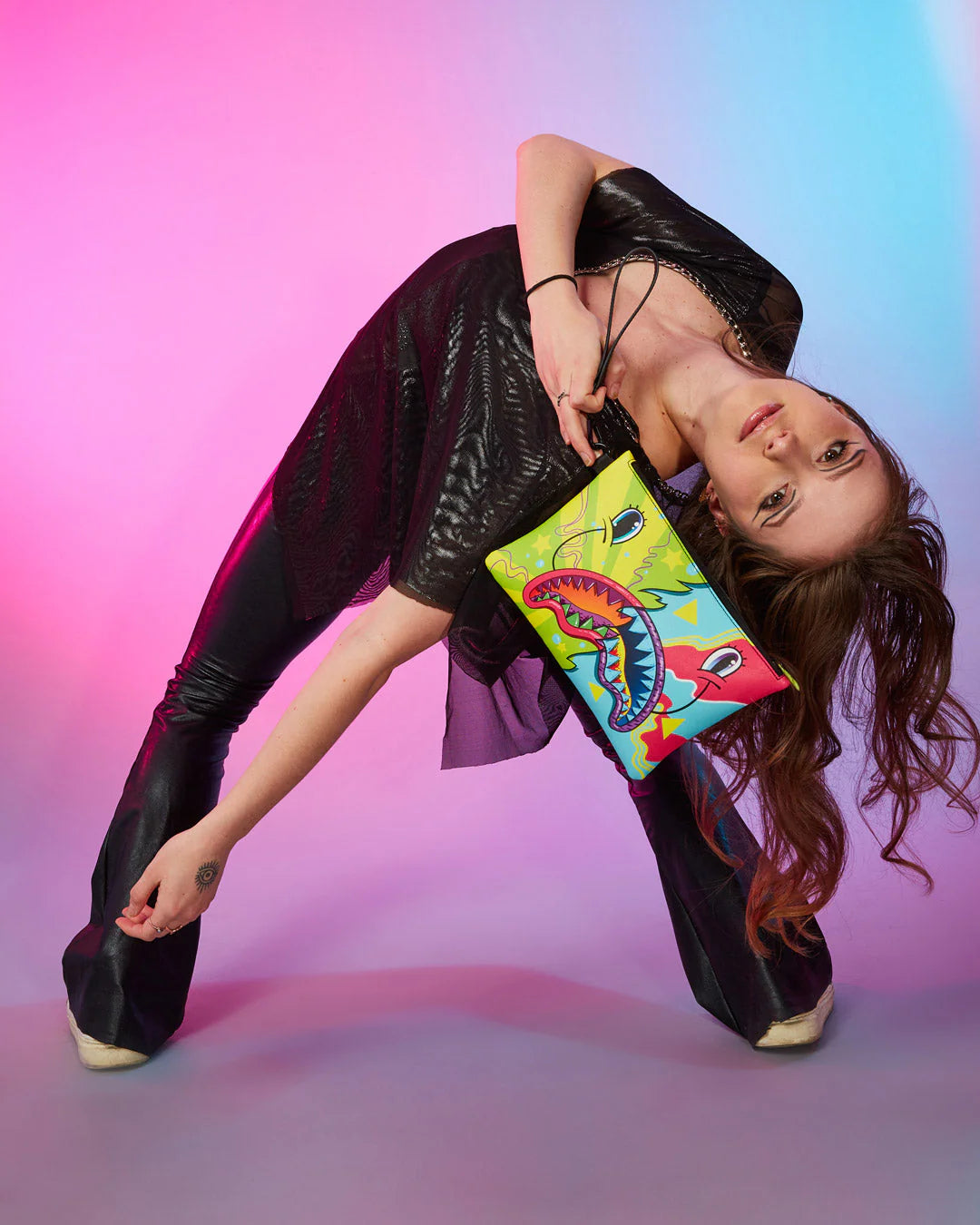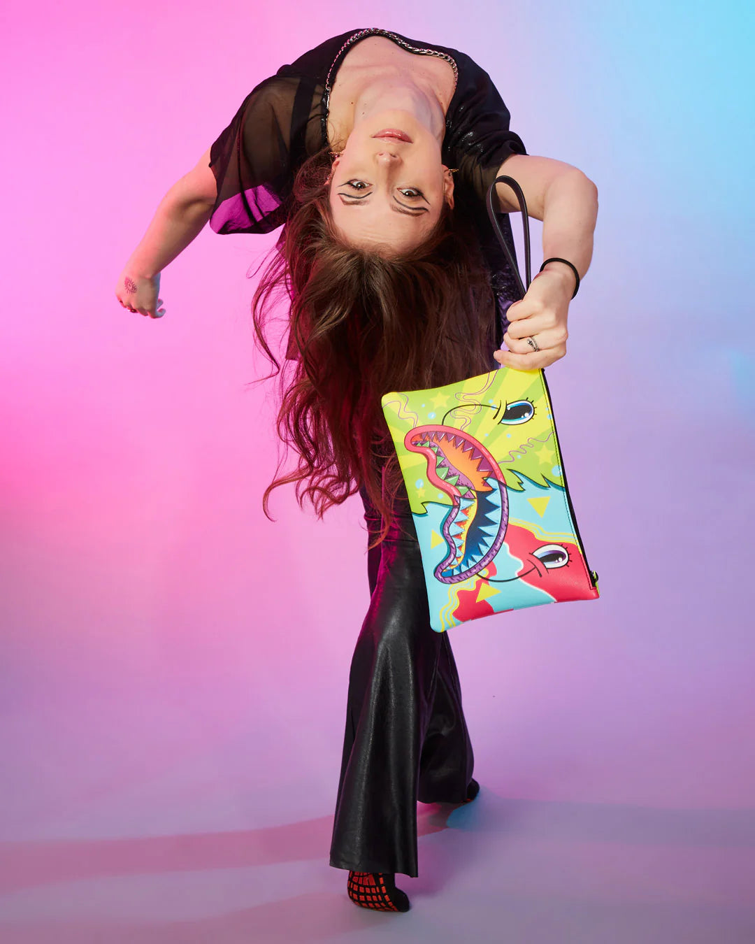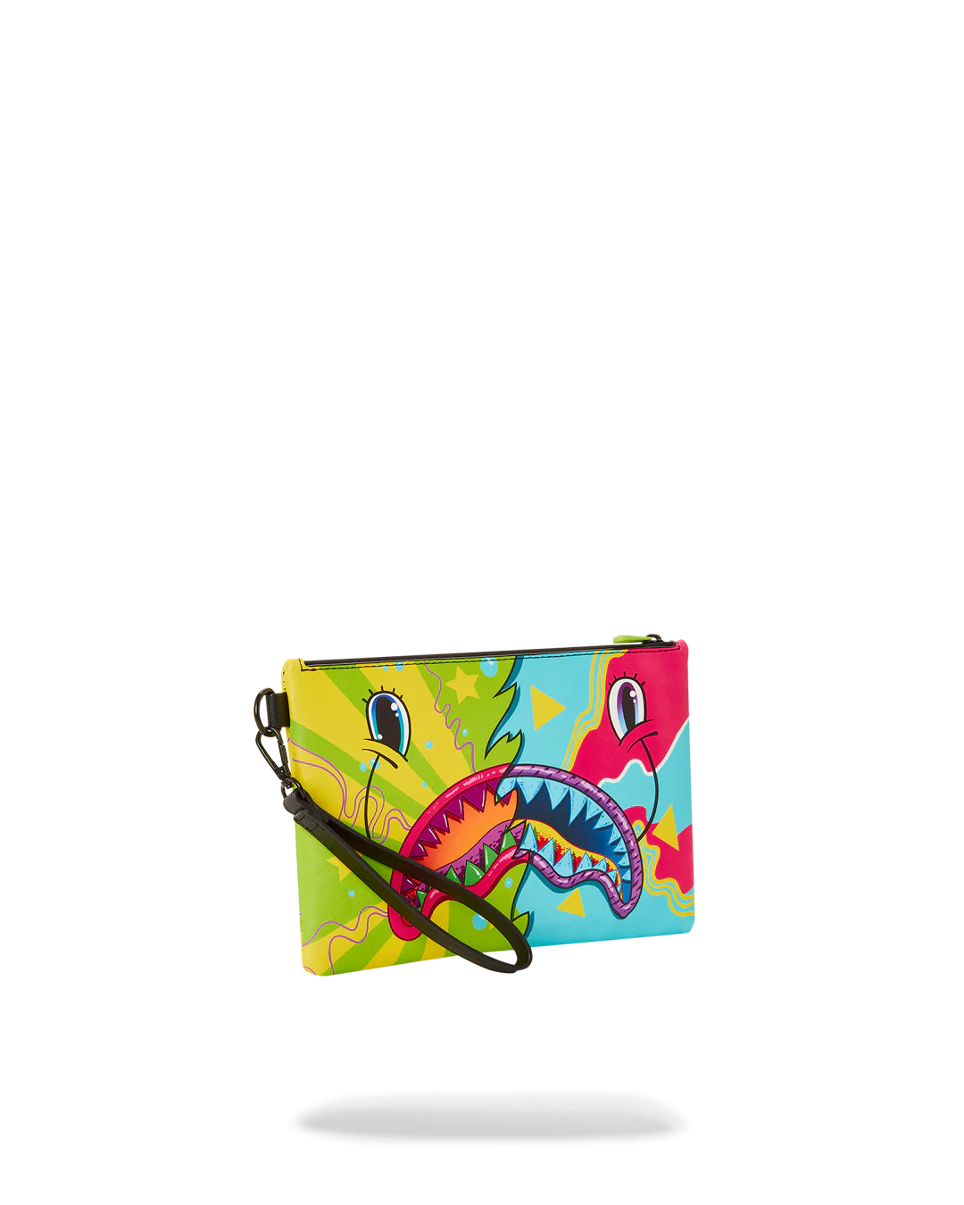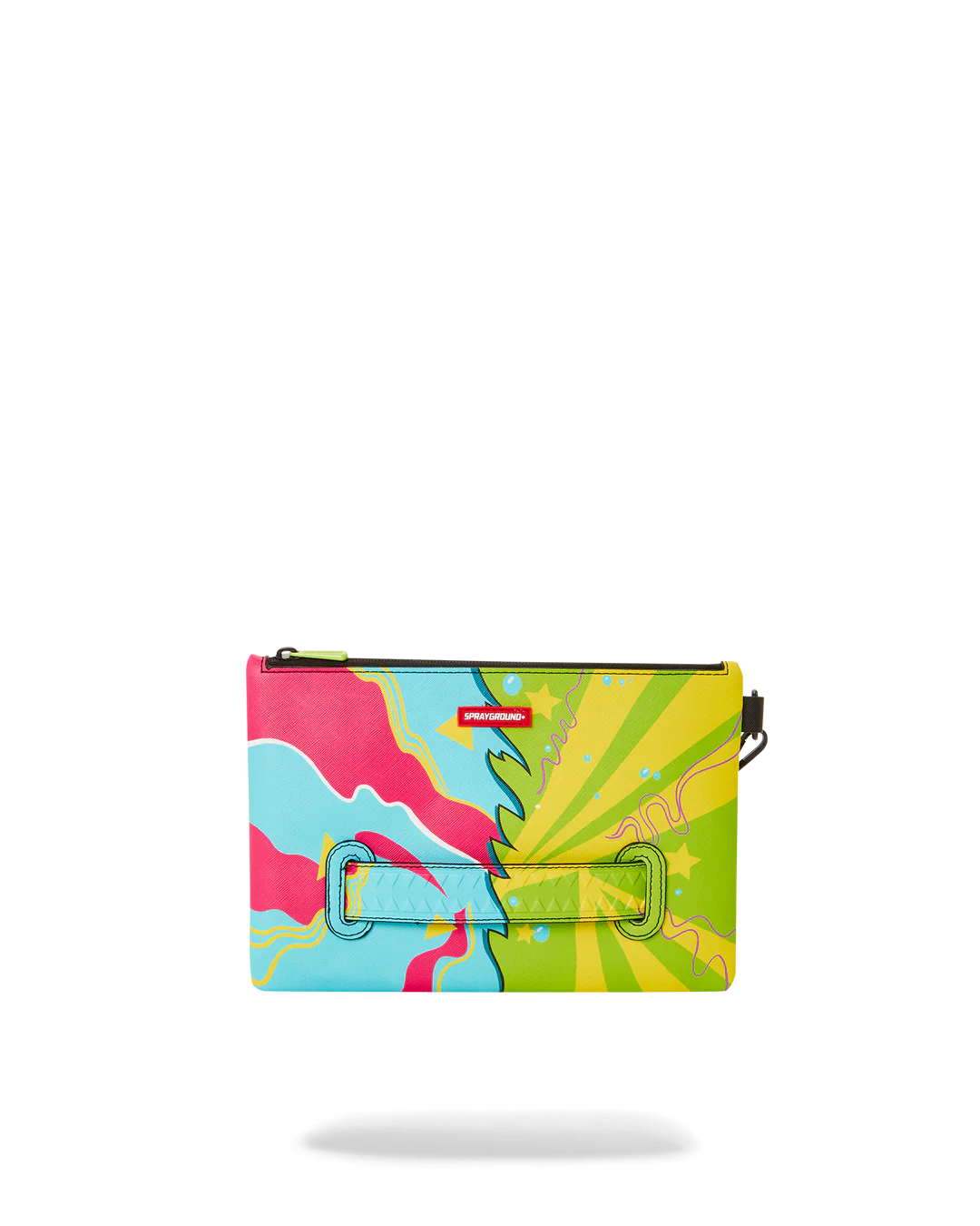 Pochette con cinturino da polso rimovibile, maniglia sul pannello frontale, chiusura a zip, tasca segreta sulla cucitura laterale