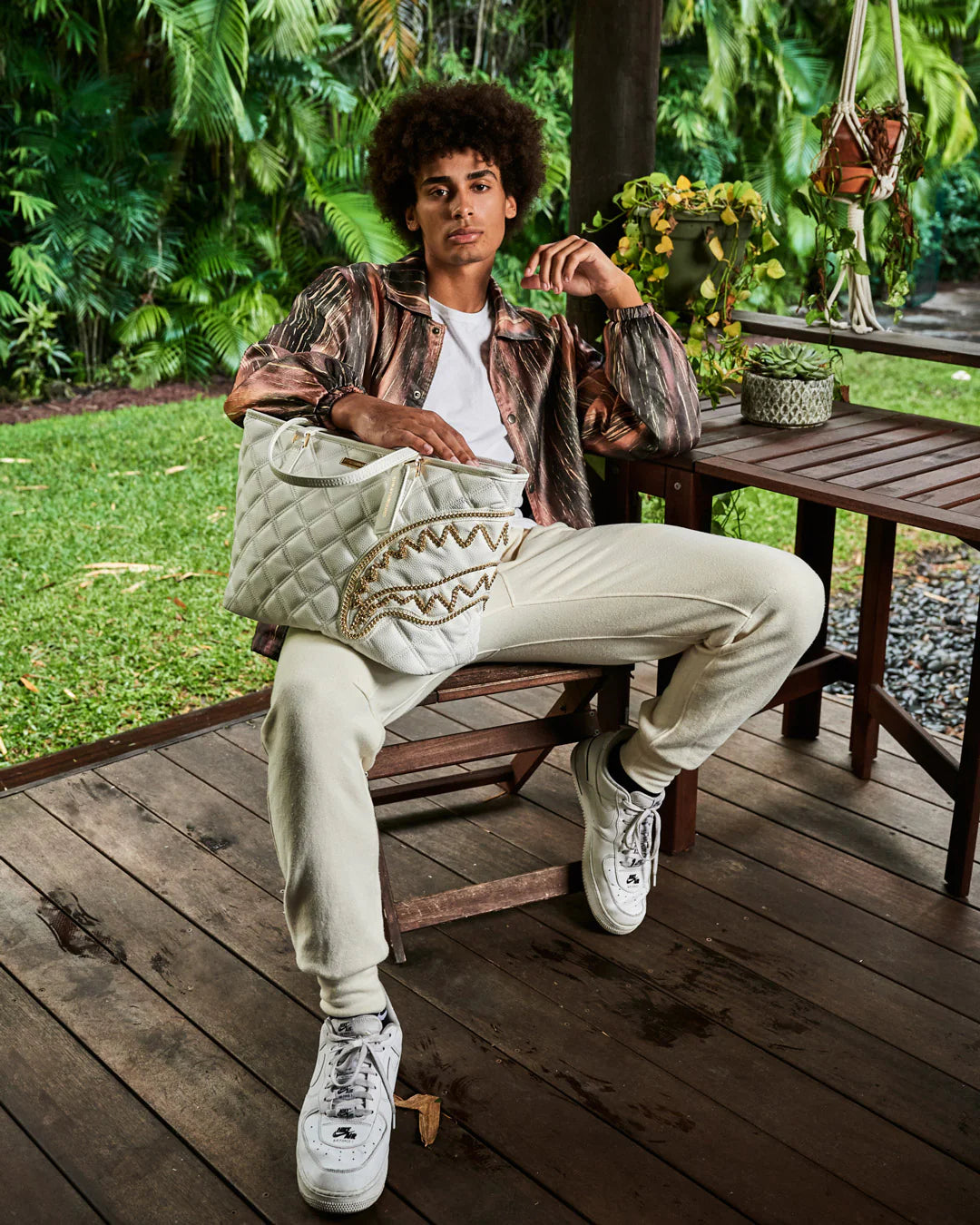 Dimensioni: 48cm x 17cm x 29cm • Apertura superiore con cerniera • Doppio manico superiore • Portachiavi Sprayground • Cerniere dorate con hardware in metallo